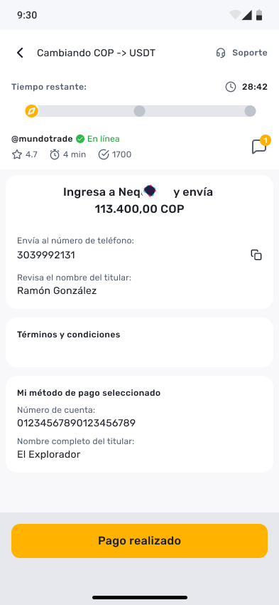 El resto de la experiencia es la misma. Una vez aceptada la orden por parte del comerciante, ambos podrán completar su transacción P2P con la misma experiencia sencilla de El Dorado.